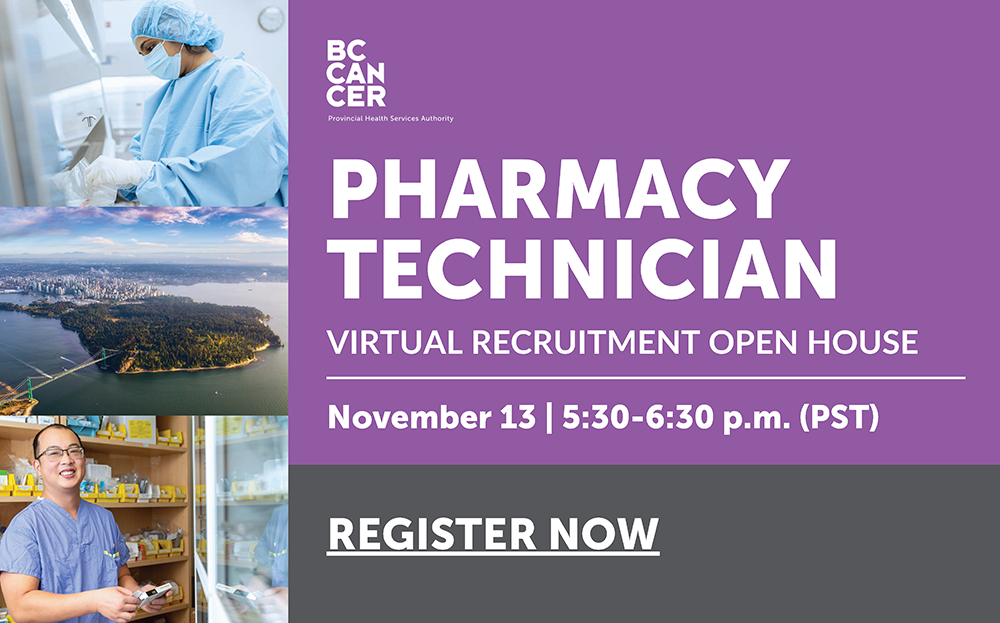 Are you a Pharmacy Technician looking to make a difference in cancer care? Join our virtual OPEN HOUSE to learn more about Pharmacy Technician opportunities at BC Cancer.