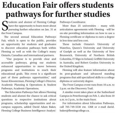 | Fleming College Education Pathways Fair to take place at Frost, Sutherland campuses | N/A | N/A | January 11, 2017 | ||