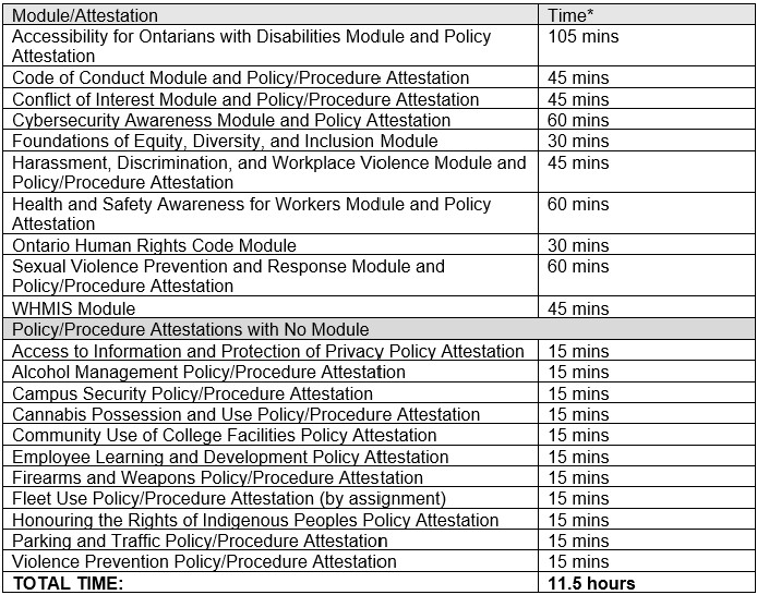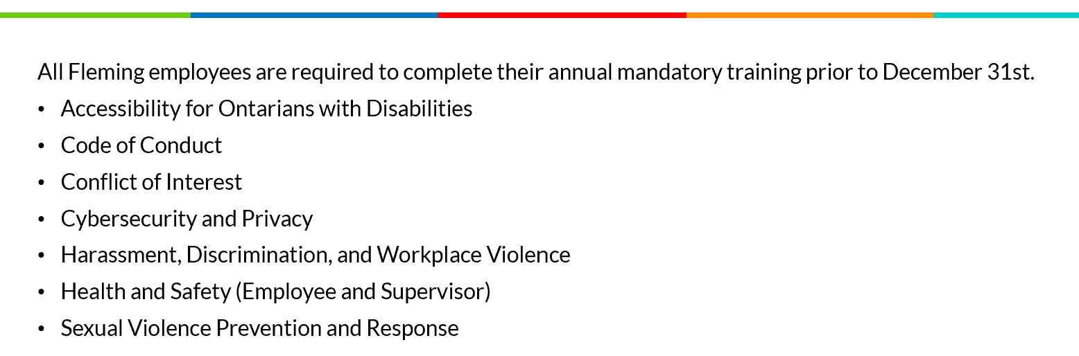 The College is required by various legislation to ensure that employees receive specific workplace training. Mandatory training is required upon hire and on an annual basis to ensure compliance with industry best practice. Mandatory Training modules are available on the Desire2Learn (D2L) platform, known as Fleming Learn. This is a single sign-on platform, set up with your Fleming credentials. To access Fleming Learn, visit: https://learn.flemingcollege.ca/d2l/home