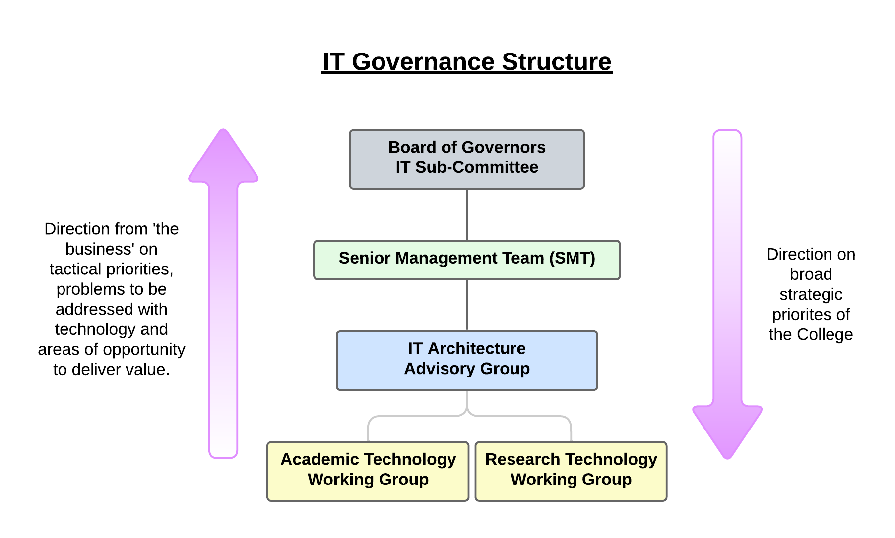 The College’s IT governance framework helps to ensure that IT continually modernizes and leverages opportunities while managing disruptive technologies with an agile and responsive approach. The IT governance committees and working group coordinate efforts to achieve the College’s IT goals as outlined in our strategic and academic plans.