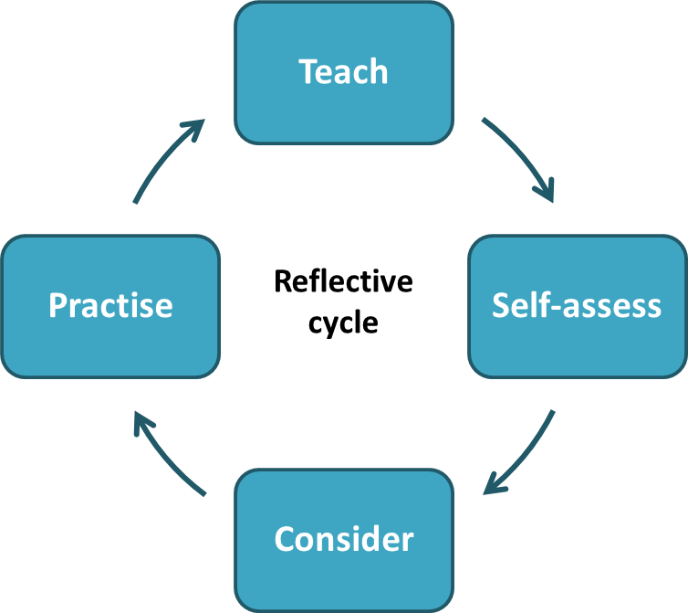 Image of reflective practice cycle: teach, self-assess, consider, and then practice.