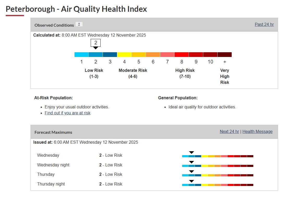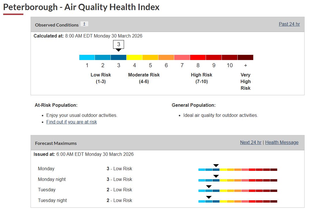 Outdoor air quality and visibility may be affected due to forest fires. Wildfire smoke can be harmful to everyone’s health even at low concentrations. Individuals with respiratory conditions or other at risk populations are at a higher risk of experiencing health effects caused by smoke. If you must spend time outdoors, a well-fitted respirator type mask (such as a NIOSH certified N95 or equivalent respirator) that does not allow air to pass through small openings between the mask and face, can help reduce your exposure to the fine particles in smoke. Check the Air Quality Health Index (AQHI) and monitor your symptoms.