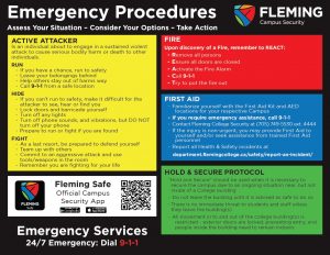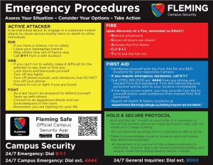 The procedures outlined below are posted in classrooms and washrooms throughout the College. Accessible and Printable PDF versions of this document and other emergency procedures are available here: