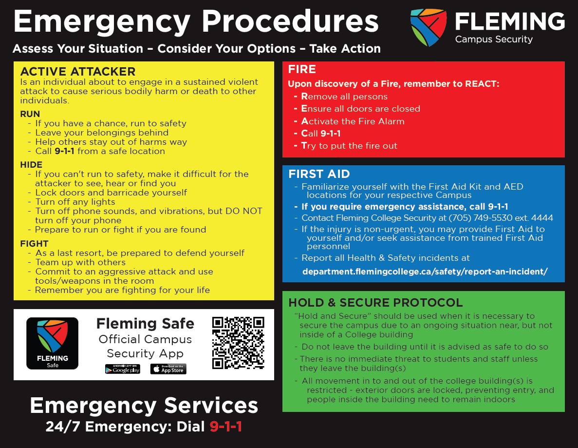 Emergency Procedure posters have been placed in all classrooms, labs and washrooms at each campus. It is important for all members of the College Community to be aware of and familiar with these Emergency Procedures so that you know what to do when an emergency happens. The procedures outlined below are accessible and printable PDF versions of this document.