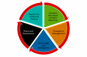 Fleming College’s Department of Emergency Management & Campus Security operates through a comprehensive framework built around five core pillars: Campus Security & Incident Reporting, Emergency Management, Technology & Intelligence, Policy & Governance, and Beyond the Uniform & Training. Together, these pillars create a resilient safety infrastructure that enhances the overall success and sustainability of the institution. By integrating these five pillars, Fleming College creates a comprehensive safety and emergency management system that not only protects its community but also promotes a positive learning environment. A secure campus attracts students, staff, and partners, facilitating academic excellence and operational efficiency. Furthermore, a proactive and well-coordinated approach to security and emergency management minimizes disruptions, reduces risks, and demonstrates the college’s commitment to the well-being of its community—all of which are essential to the institution’s long-term success and reputation.